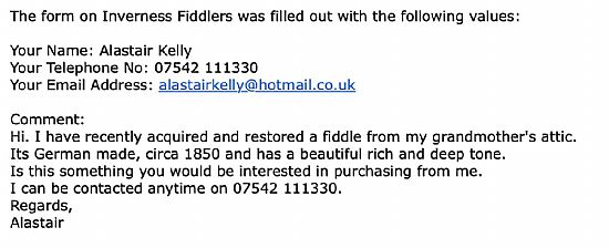 Inverness Fiddlers occasionally hear of quality instruments for sale. When we do, we will list them below for perusal;